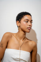 Pair the Mini Baguette Lariat Necklace with our Clear Baguette Earrings to create a powerful and coordinated look. The lariat style is adjustable, so you can wear it as a choker around your neck and have the rest of the chain falling down elegantly, or you can style it to be a part of your layering look.