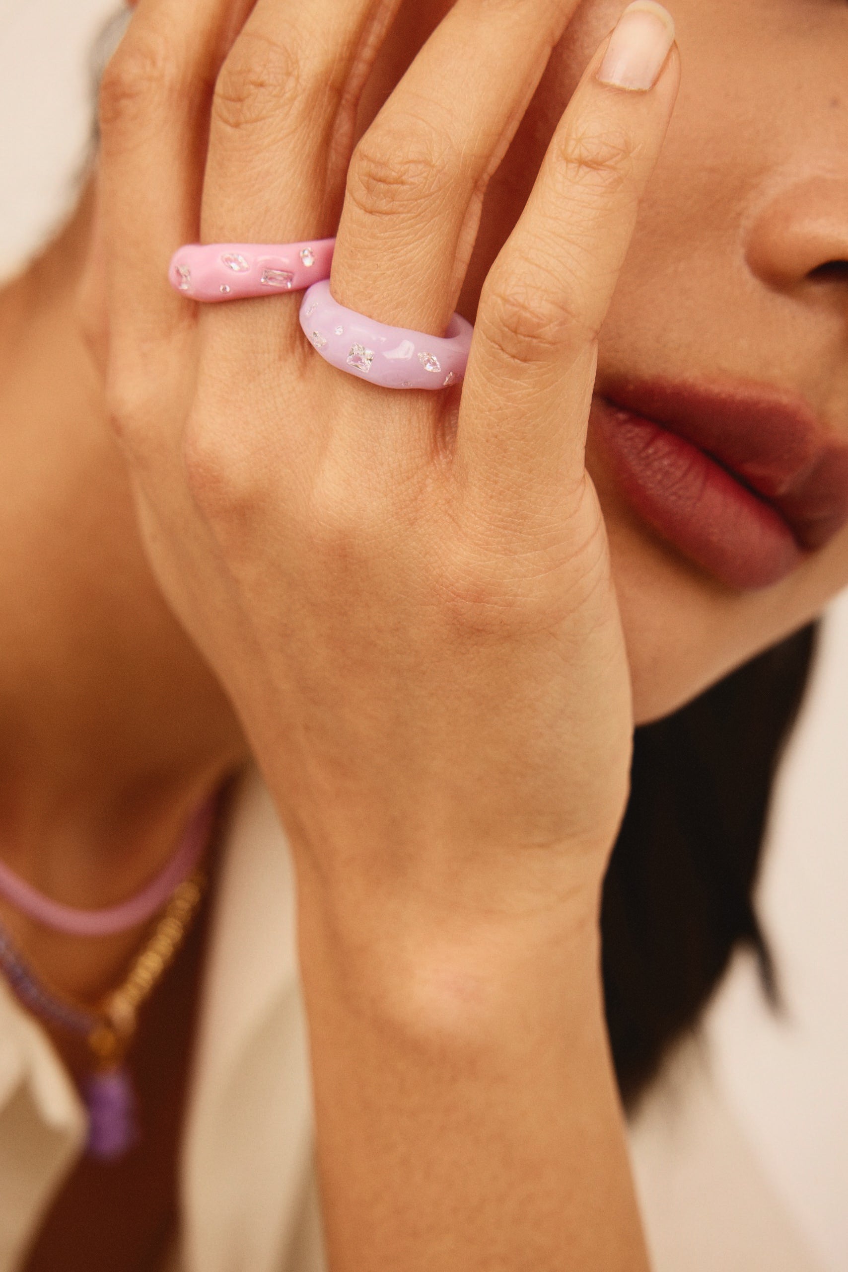Cosmo Ring in Lavender adds a dreamy pop of color with a touch of celestial sparkle. The softly tinted lavender resin creates a smooth, luminous base, while scattered cubic zirconia shimmer like tiny constellations. Playful yet polished, this ring brings a lighthearted glow to any look.
