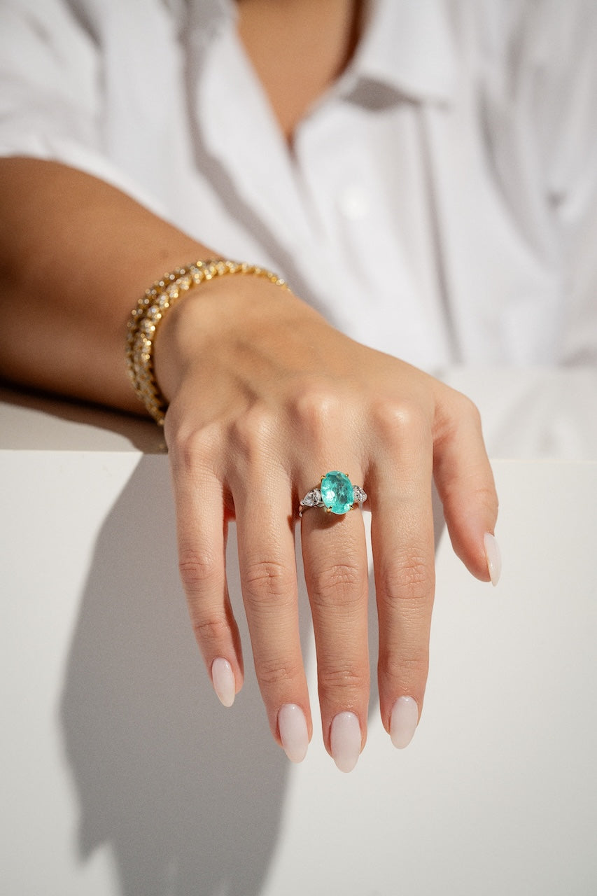 At its heart lies a captivating synthetic Paraiba gemstone, with its radiant, oceanic hue reminiscent of tropical waters. The oval-cut centerpiece is perfectly complemented by a sleek band, creating a harmonious blend of sophistication and modernity.
