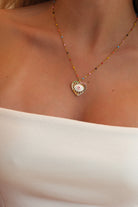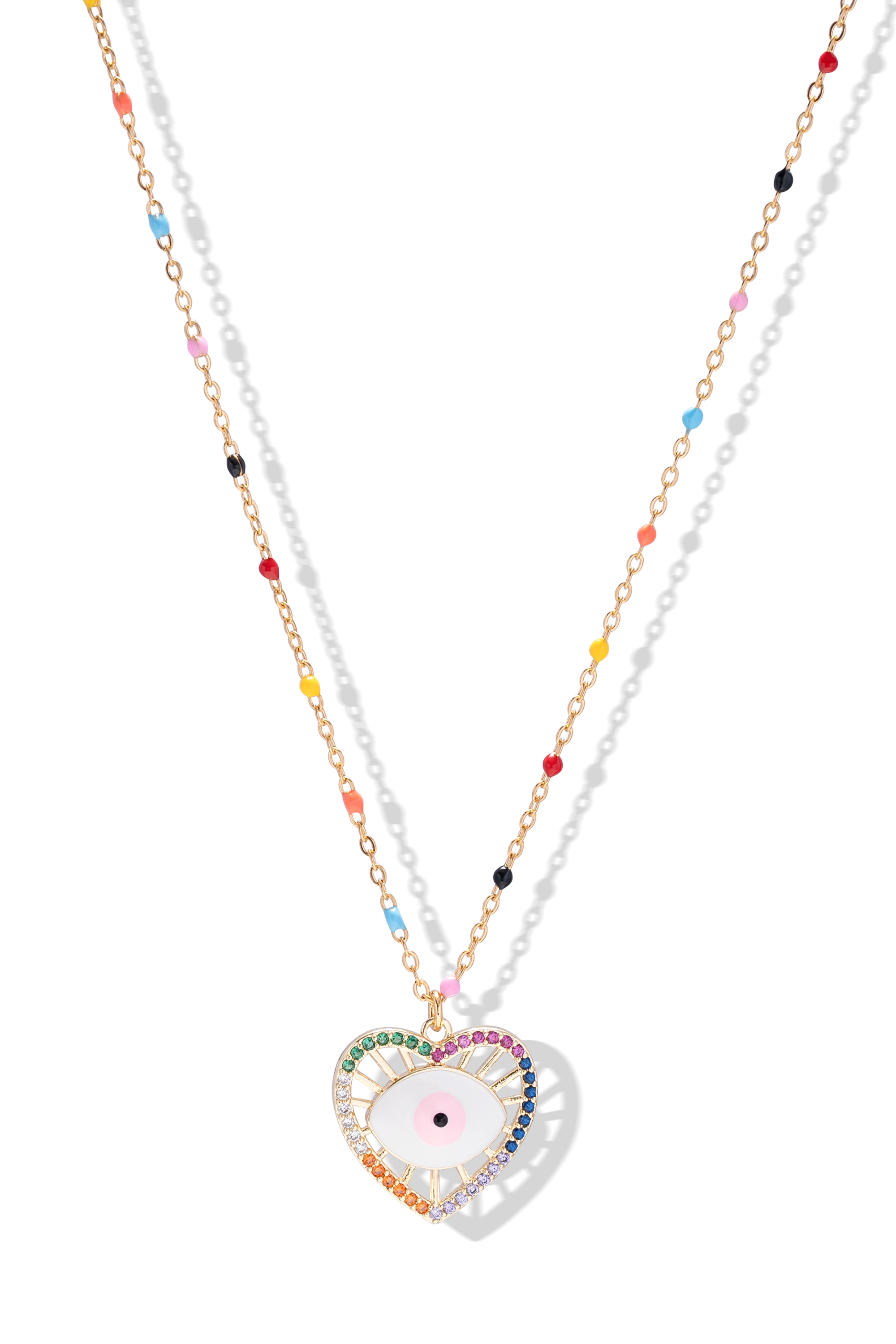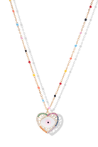 This gold heart shaped evil eye necklace is the perfect statement accessory, abundant with spiritual undertones and positive energy. Aptly named Only Cuteness, the candy pink evil eye sits in the centre of a heart and is surrounded by sparkling rainbow colours of the sacred chakra. Tiny enamel rainbow beads also elegantly cascade down the dainty chain, adding extra charm to this colourful necklace.