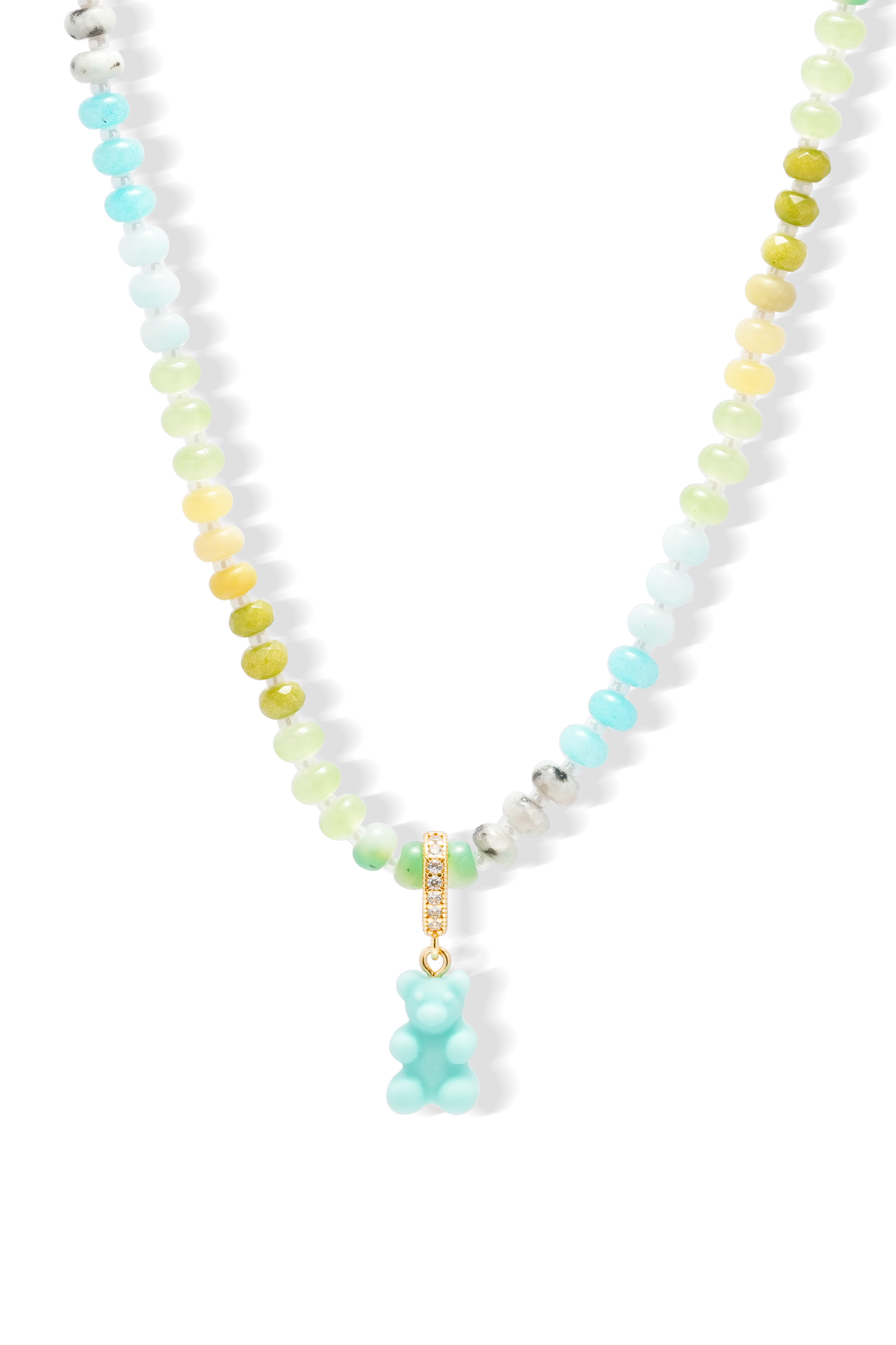The ocean hues of blue and green make this beachy beaded necklace the home to one of our iconic baby blue Nostalgia Bears – the perfect piece to throw on with your bikini, or to add a pop of colour to your everyday.Â