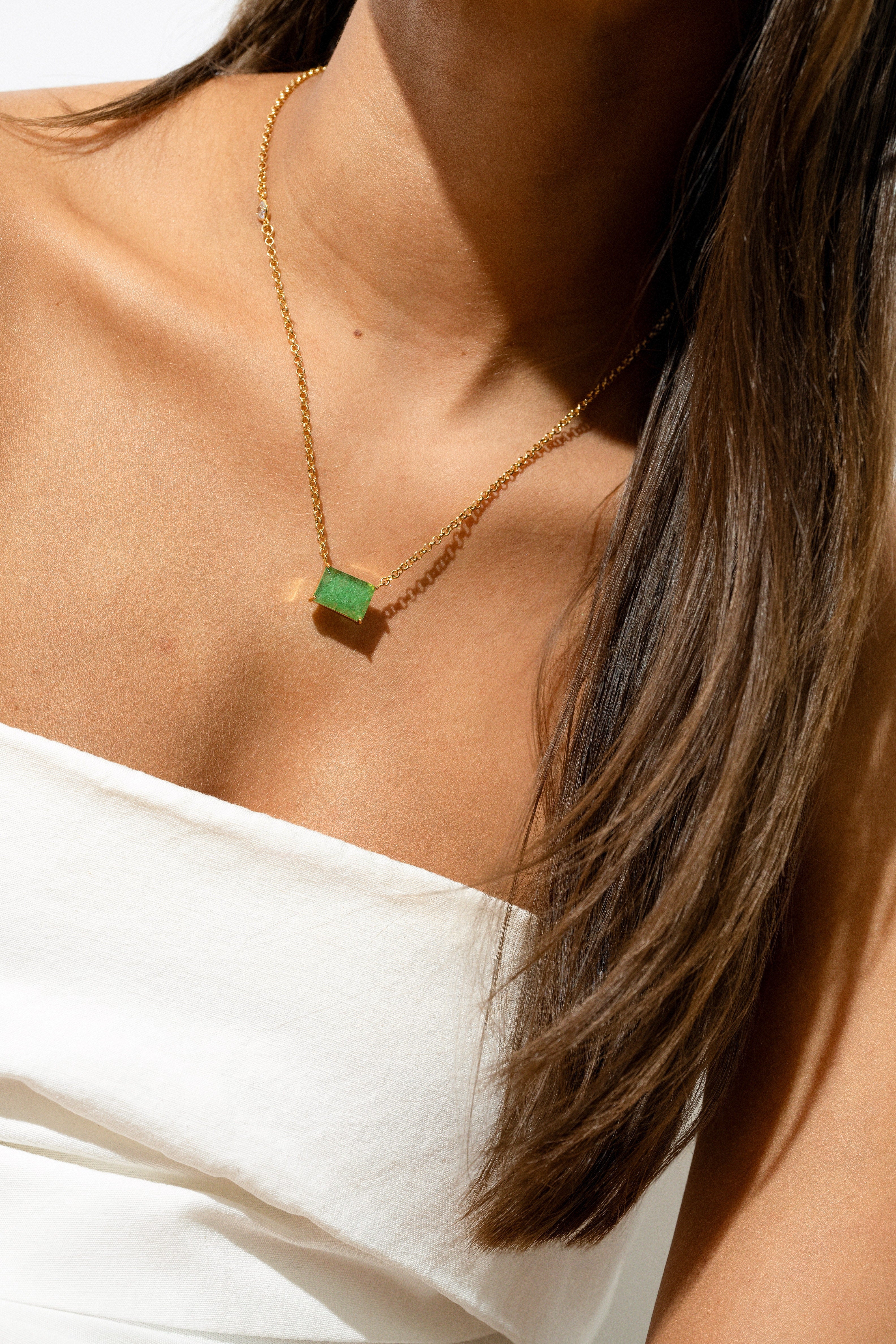 Set on a delicate gold-toned chain, the clean baguette cut offers a modern, minimalist aesthetic while allowing the vibrant green hue to take center stage. A small accent stone along the chain adds a touch of unexpected detail and soft sparkle.