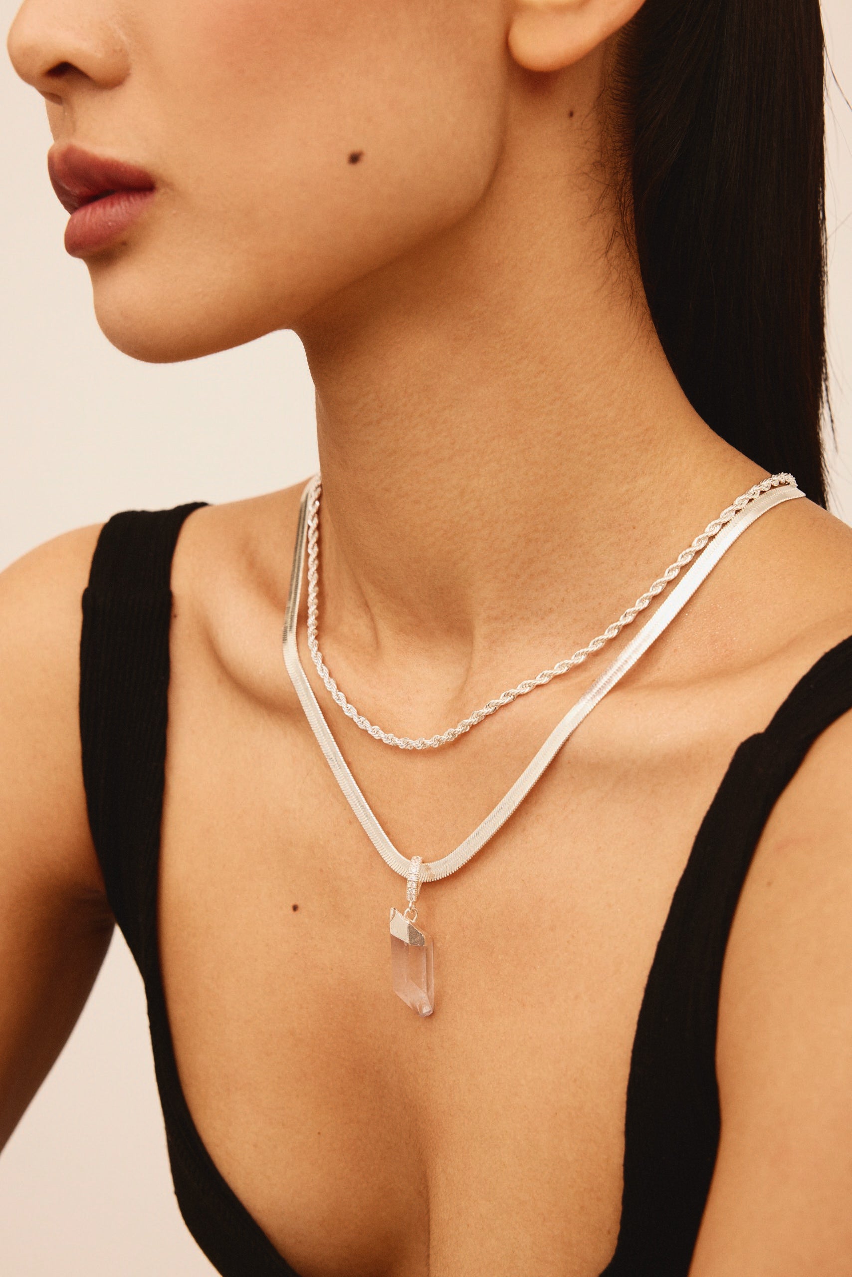 The Medusa Chain is all about effortless power and quiet glamour. Smooth, fluid, and irresistibly sleek, this chain glides along the neckline with a soft, liquid shine that feels both modern and timeless. Its refined silhouette makes it a standout on its own and the perfect foundation for layering charms or pendants.