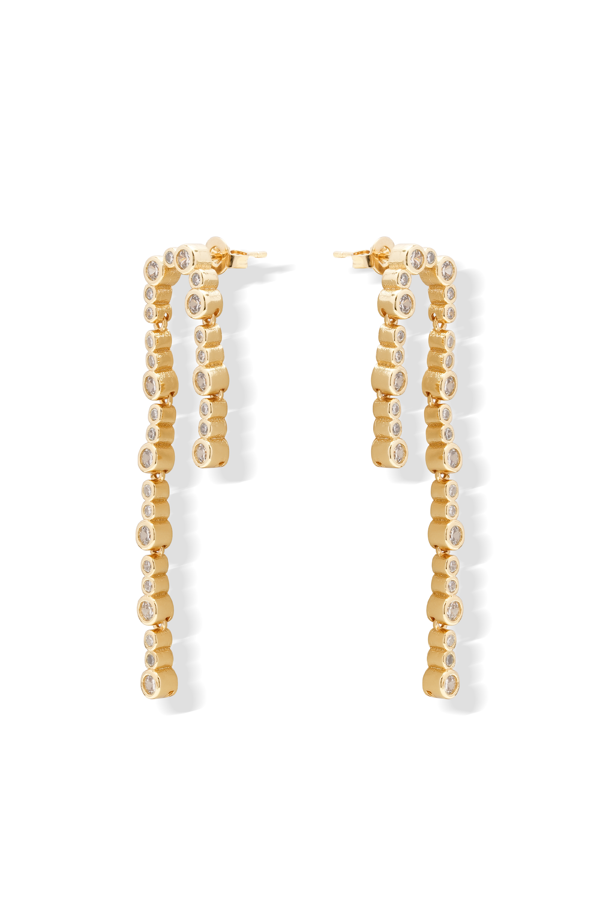 These were created for the minimalist who likes to play with statement jewellery from time to time. Delicately long layered strands of sparkling cubic zirconia make these the perfect chic accompaniment to your occasion earring collection.