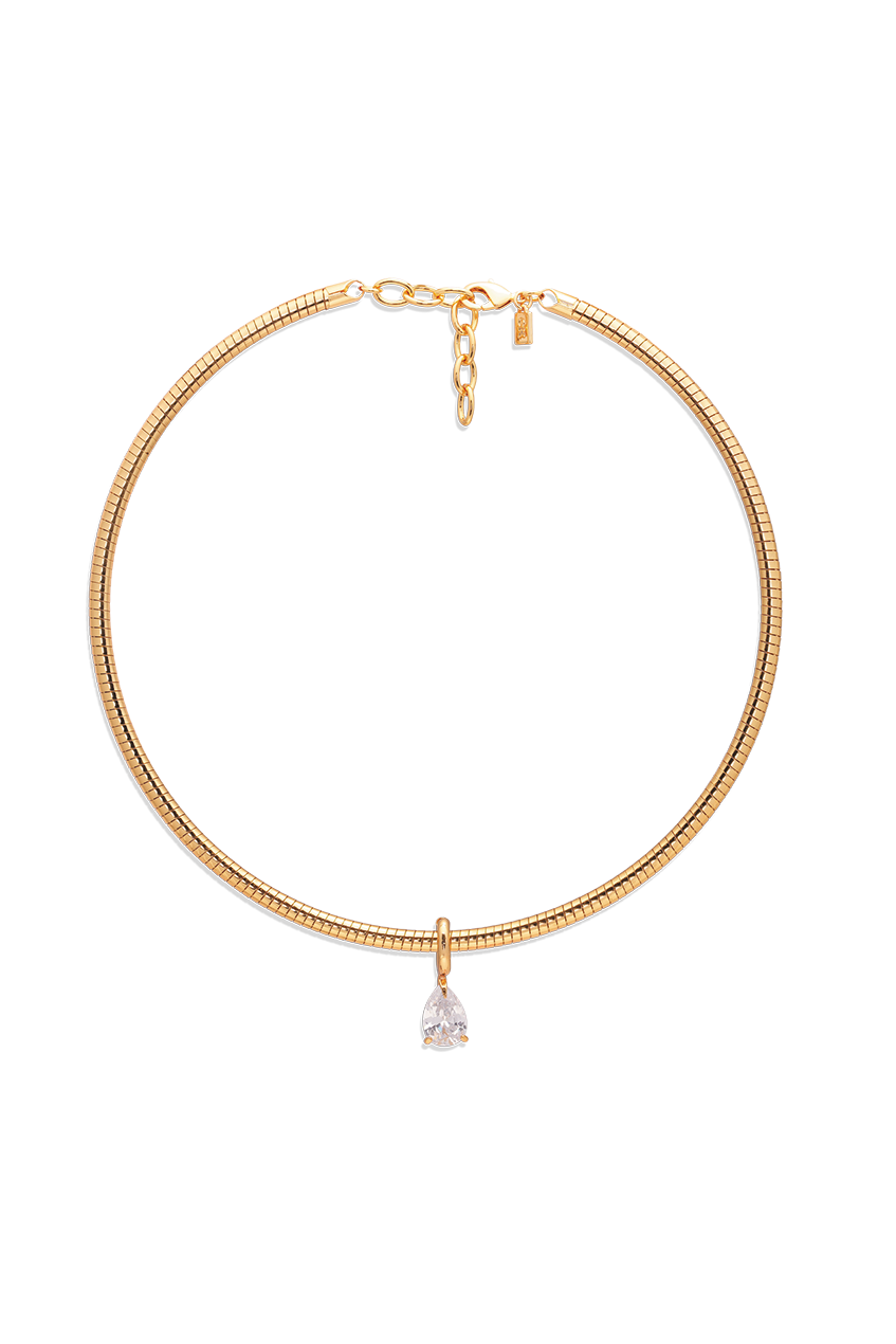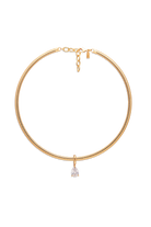 A single sparkling cubic zirconia charm hangs on a structured, gold, textured silhouette with a lobster clasp to mirror the style of a bangle, but this time, it has been created to be worn around your neck.