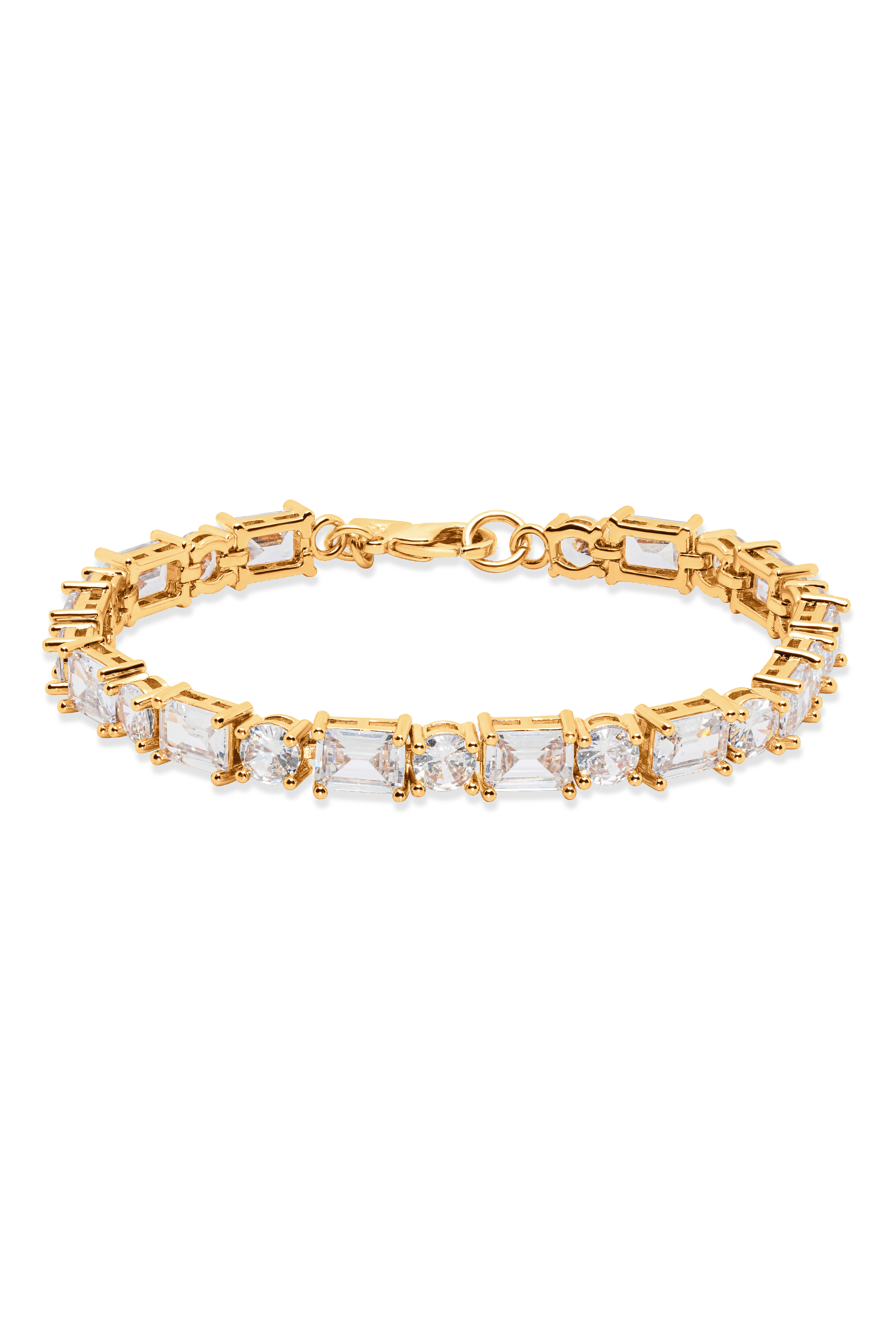 Exude timeless elegance with the Eternity Bracelet, featuring a unique combination of baguette and round-cut cubic zirconia. Set in 18k gold-plated brass, this bracelet has the perfect balance between modern sophistication and classic charm, making it a standout piece for any occasion.