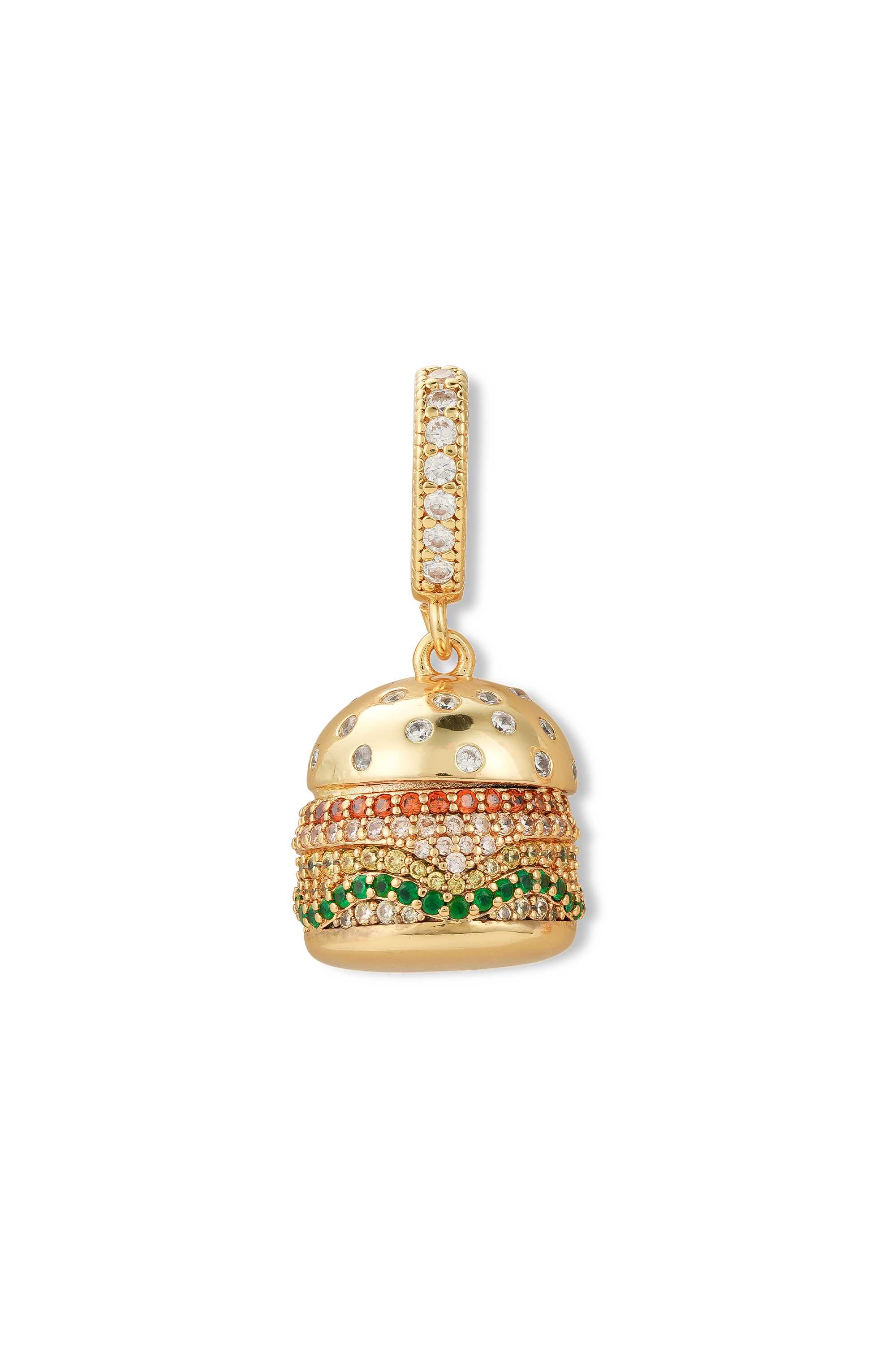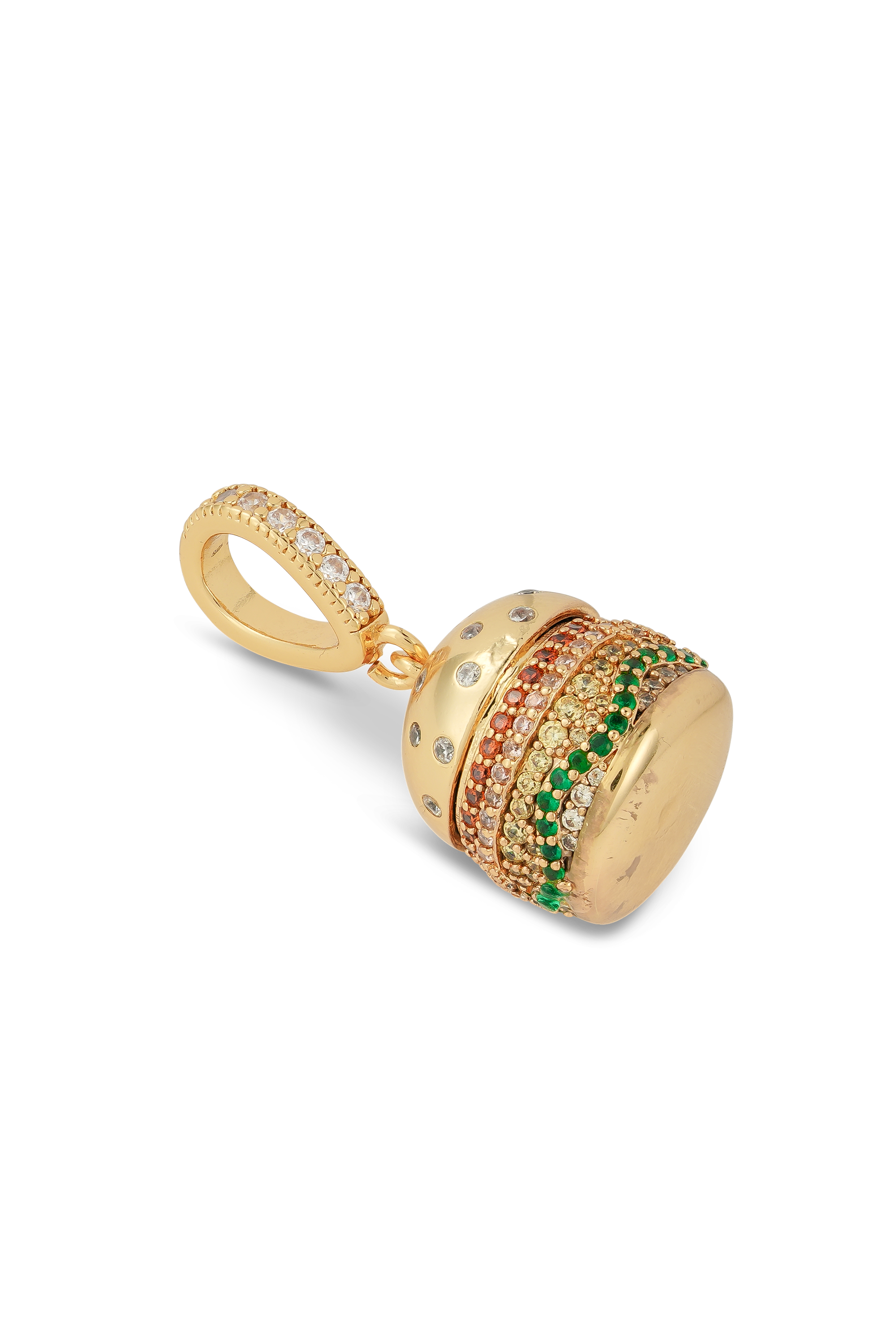 Serve up style! The Juicy Bite Pendant is a playful, burger-inspired charm crafted in radiant gold and sparkling pavé stones. With layered gemstone details and a diamond-studded bun, this deliciously bold piece adds a fun twist to fine jewelry. Perfect for collectors, food lovers, and anyone who likes their accessories with extra flavor.
